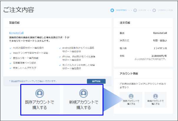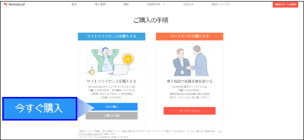 ご購入の手順のページ(https://www.remotecall.com/jp/pricing/purchase/)より「今すぐ購入」ボタンをクリックしてください。
