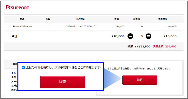 契約内容と金額をご確認いただき「同意」項目へチェックを入れた後、「決済」ボタンをクリックしてください。