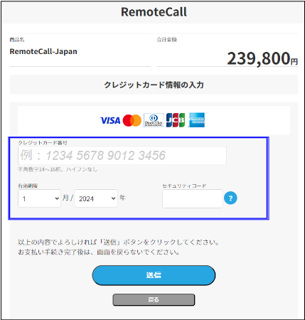 クレジットカード情報を入力して送信ボタンをクリックします。