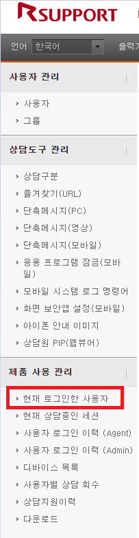 '제품 사용 관리' > '현재 로그인한 사용자' 메뉴를 클릭하여 원격 지원 이력을 조회하실 수 있습니다.
