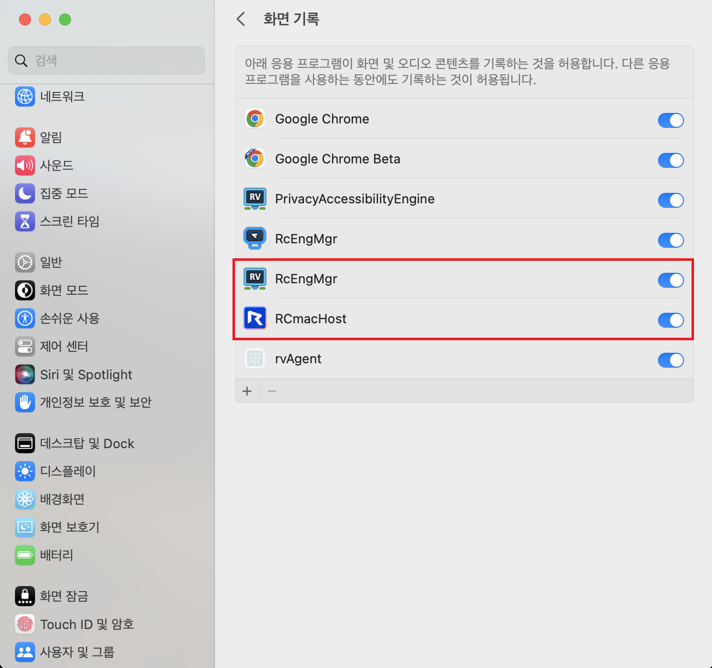 2. 환경설정 > 개인정보 보호 및 보안 > 화면 기록 > RcEngMgr, RCmacHost 모두 허용